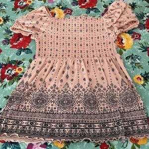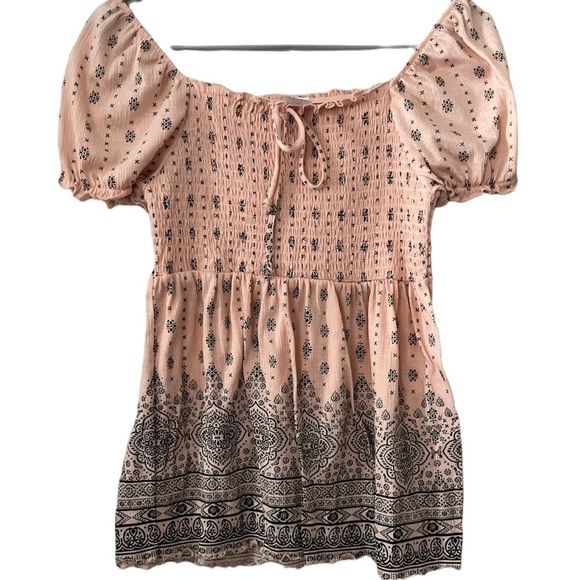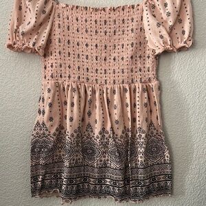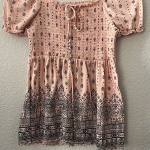 Never got the chance to wear this shirt. Super cute and looks amazing with shorts! Cute ruffle detail on the bottom and soft pink color it is a great shirt for the summer.
