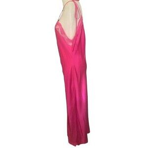 Nordstrom 100% fuchsia pink silk gown featuring a sheer lace front, high slit sides, and adjustable shoulder ties.