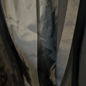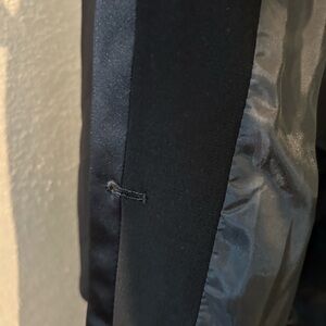 2 fully lined pockets with satin piping on each pocket. Button detail on each sleeve. Beautiful crepe material and satin lining. 29” in length