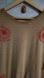 3.) description: 100%cotton,very soft to touch, very pretty brown with rolled hem short sleeve cuffs, exposed seams, has red embroidery in two horseshoes with stars one reads, "lucky star", then a red embroidered clover, along the shoulders there are red embroidered stitching, rounded and ribbed neckline, made extremely well! ๐