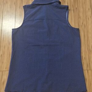 Chic and stylish sleeveless top featuring a classic blue polka dot pattern. Perfect for casual outings or a day at the office.
