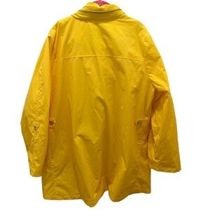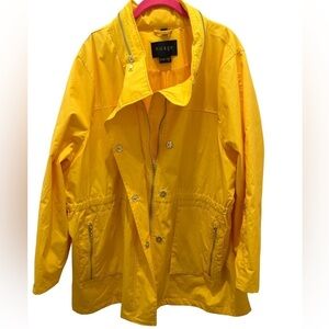 NWOT. Front Zip Closure. Waterproof with hood with 2 front pockets. 55% cotton, 42% Nylon,3 % spandex. Lining 100% polyester. Bright yellow that Blends in with your preferred style and color.