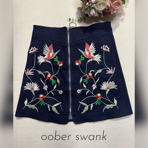 NWOT OOBER SWANK Embroidered Floral bird Denim Mini Skirt