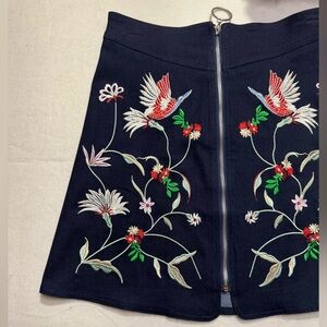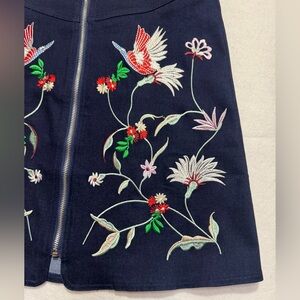 NWOT Elevate your style with STRETCHY denim mini skirt, featuring exquisite bird and floral embroidery. Perfect for any occasion.