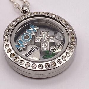 NWOT ORIGAMI OWL Locket Necklace Charms Mom Nana Family Cross Crystals $130 msrp