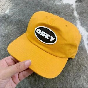 Here’s a super cool hat by Obey. New without tags and in great shape. Nice yellow with a black and white rubber like logo on the front. One size fits most, it does have an adjustable back as shown. Perfect hat for everyday wear. Great for men or women.