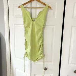 Flirty and figure-hugging Oh Polly “Zarina” bodycon mini dress in a vibrant light green. Features a deep plunge neckline, adjustable ruched sides with ties, and soft stretch knit for a curve-skimming fit.