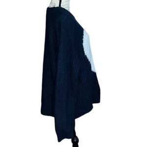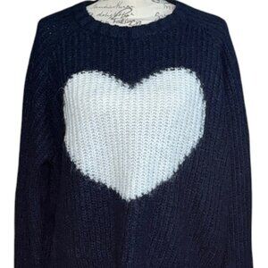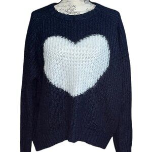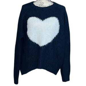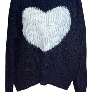 Cozy up in this stylish navy blue sweater featuring a charming white heart design. Perfect for adding a touch of warmth and style to your wardrobe.
