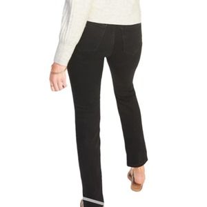 Old Navy High-Waisted Power Slim Straight Ripped Distressed Black Jeans. Secret-smooth front pockets hold you in for a smoothing effect. Soft, black wash denim with just enough stretch. High rise, fitted through hip & thigh, slim straight leg. Contoured waistband. Features zip fly with button closure, belt loops, riveted scoop pockets & coin pocket at front, patch pockets on back. Color is called black jack.