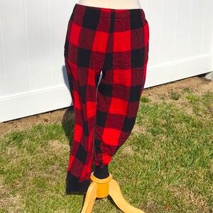 NWOT Cozy Jogger Style Lounge Pants/ Pajama Bottoms in a classic buffalo plaid pattern in red and black are a Size Small. Features a drawstring waist measuring 15 inches for comfort with slash pockets on sides. In seam length measurement 25 inches. Excellent preowned condition…refer to photos. Selling from a smoke free and pet free home.