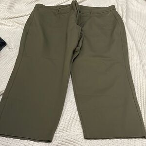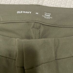 Olive green, high rise, pixie fit, full length, hits at ankle