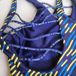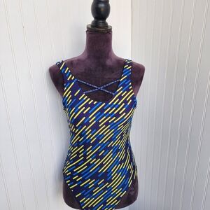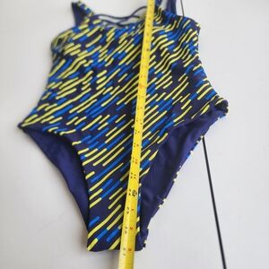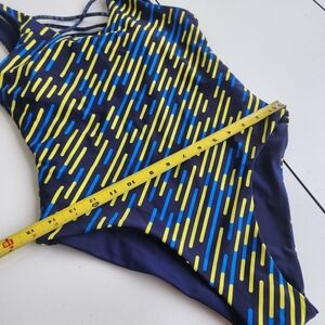 NWOT One Piece Swimsuit Navy Yellow Geo Scoop Neck Strappy Straps Lined Cups M