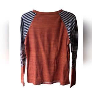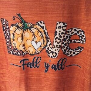Boutique Orange long sleeve shirt with 'Love Fall Y'all' print. Features striped and leopard print sleeves. PTP 18- 26 WILL FIT SMALL-LARGE.
