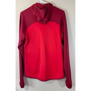 Red orange with burgundy contrast. Zippered pockets. Thumb holes. Very soft fabric. Fleece lined.