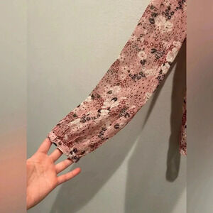 New without tags / pink, brown, metallic floral pattern/ ruffled v-neck / lace up detail with metal detail in tassels / extra button on tag / 95% polyester