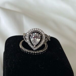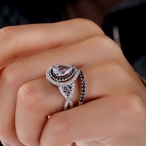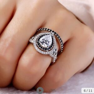 🖤🖤ABSOLUTELY GORGEOUS STERLING SILVER PEAR SHAPE BLACK AND DIAMOND CZ RING WITH ETERNITY BAND. # OF STONES IS 87 AND CENTER STONE IS 2.87 CTS🖤🖤🖤