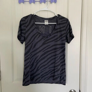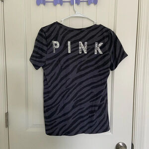 Women’s PINK Victoria’s Secret top. Top is gray & black zebra print patterned with a v-neck cut. Back has PINK in silver sequins spelled out across the upper back. Size medium. Smoke free home!