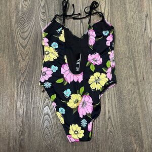 NWOT PINK Victoria's Secret One Piece Swimsuit Floral V-Neck Black Multi Medium