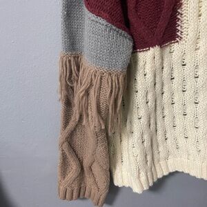 Chunky textured knit with fringe details. Colorblock pattern. Foldable collar with one button detail.