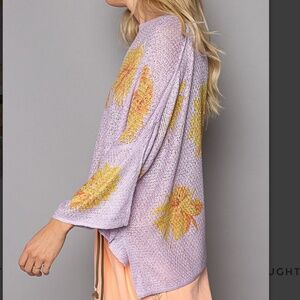 Embrace style with this floral knit sweater, featuring a charming lilac hue and vibrant yellow flowers. Perfect for adding a touch of elegance to your wardrobe. 3/4 length sleeve. Oversized Small.