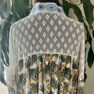 Bring a sense of style and elegance to your wardrobe with this lightweight, dreamy kimono featuring a breezy botanical print in sun-washed hues of navy, gold, and ivory, in a contrast of lace trim around the bell sleeving, shoulders, and elongated front border. The open-front design flows effortlessly, while wide bell sleeves and a contrast printed trim add a touch of bohemian flair. Perfect all year round wear layered over denim and tops for effortless style. Sheer lightweight fabric, contrast boho border trim. This piece could easily be styled as an elevated loungewear look, or worn at a poolside resort to add extra flair to your overall vibe.