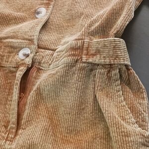 NWOT POL Heavy Tan Corduroy Romper Shorts with Button and Zipper Front, Side Pockets, and Button Cinched Tabs on Waistline. The stock photo has long sleeves, this listing is the same except it has 1/2 sleeves.