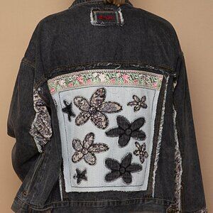 Stylish jean jacket with patchwork design. Features flower patch detail, and floral pattern accents in corduroy fabric. Perfect for casual wear. Designed in button down, collared, lace and floral patch detail long sleeves denim jacket