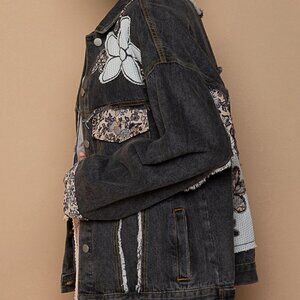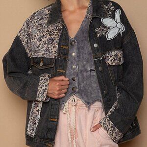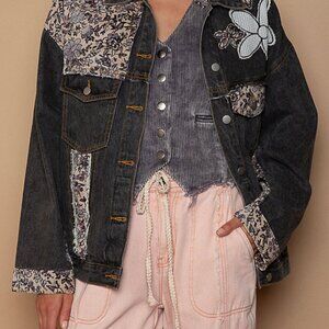 NWOT POL Washed Black Denim Jacket with Corduroy Floral Patch Detail