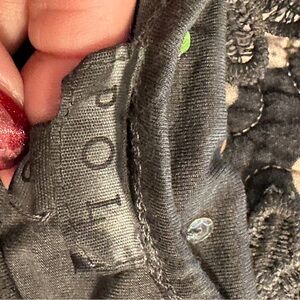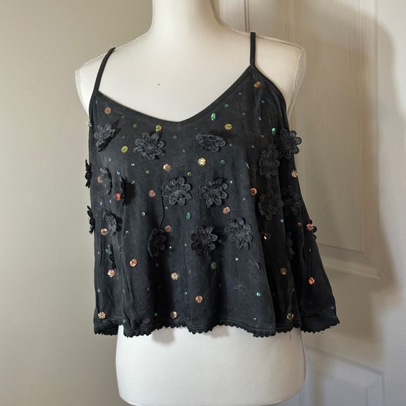 NWOT POL spaghetti strap black sheath top with crocheted flowers attached along with sequins. She is oversized. Her length I measured with straps tightened about 1/4 of length. Her measurements and materials are shown in the pictures. She would look great under a jean jacket or make it stunning under a blazer.