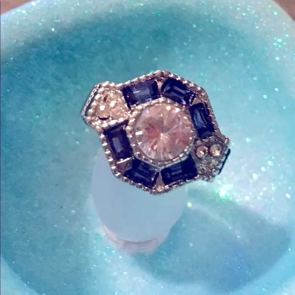 NWOT Silver colored metal with a clear stone in center encircled with 6 blue stones and very tiny clear stones as well. Size 7