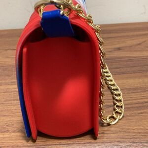 NWOT red, white & blue shoulder/ crossbody handbag with gold tone hardware. Quilted front & back flap, push clasp, 1 interior pocket. Gold tone chunky chain strap that can be doubled to use as a shoulder bag. Additional red & blue adjustable cross body strap attached to chain strap.