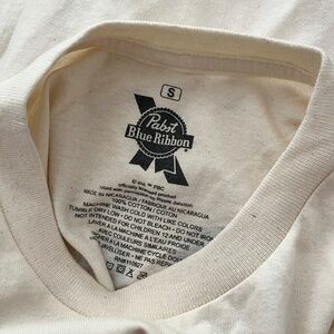 Pabst Blue Ribbon Support Your Local Dive Bar T-Shirt. Of white/oatmeal color. Screen printed graphics on front and back with a crackled effect that makes the t-shirt look worn and broken-in. 100% cotton. This item is intended for adults of legal drinking age.