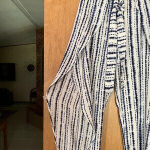 The last photo is not of these pants, but just to show what they look like on a person. Pants are NWOT, size M (size 8 to 10) in 100% rayon, open all the way up to waist, with the back coming around & tying in front, very sexy. Print reminds me of tie dye or batik. The waist laying flat across front is 14" & the in seam in 28", the outer edge is curved.