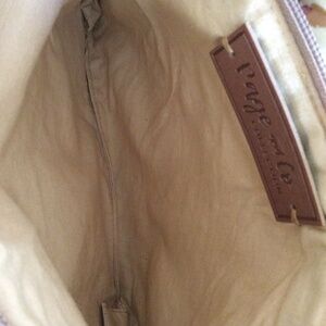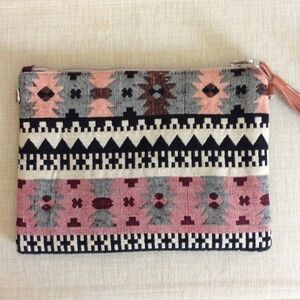 NWOT Unique handmade clutch made from repurposed Turkish carpet fabric. It has a leather carrying strap that attaches to the sides that turn the clutch into a small crossbody purse.This clutch was handmade in Istanbul, Turkey from repurposed Kilim rug fabric and suede. Dimensions: 10.5" long x 7.5" tall x 3" wide.