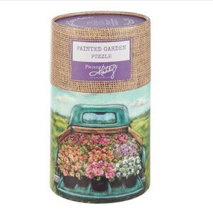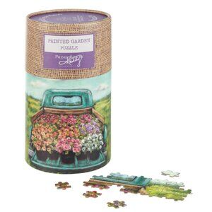 A 500 piece puzzle from Primitives by Kathy Garden Collection displaying a blue pickup with truck bed full of vibrant flowers. Design is replicated from original artwork painted onto burlap canvas, giving the art a unique depth and texture. Puzzle pieces are packaged in a resealable plastic bag and enclosed in a cylindrical box with the design wrapped around and a descriptive "Painted Garden Puzzle" sentiment on lid.