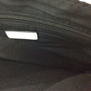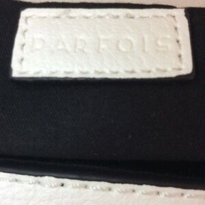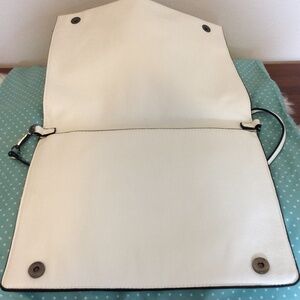 Cute white large envelope style faux leather crossbody bag with a faux zipper on the front and black trim all around the edge. Inside has one zip pocket. Bag has two round metal magnetic snap closure. Inside has a black cloth lining. Approximate measurements: 13"W x 10"H (unopened) and 19.5"H (opened). Strap drop is approximately 23".