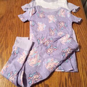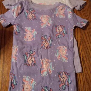 Lavender purple cotton toddler pajamas. Unicorn print. One pair pants with allover unicorn and twinkling star print and matching short sleeve top. Plus second short sleeve top with big unicorn print on front. Originally a four piece but I don't know where the shorts are, so three piece set now.