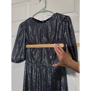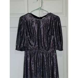 a "Sister Paul & Joe" dress, specifically the "Majestee Metallic Silver Midi Dress" from Anthropologie. It is a long-sleeved, floor-length dress with a metallic silver finish. The dress features a ruffled hem, a back zipper closure, and is made of 60% viscose and 40% metal, with a 100% viscose lining