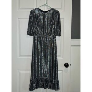 Sister Paul & Joe Anthropologie Majestee Metallic Silver Ruffled Hem Midi Dress