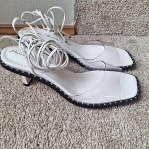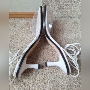 White leather with Clear band across top of foot.Kitten Heel. Silver detailing along sole. Womens Size 8 Heel height 2.5" measurements are approximate