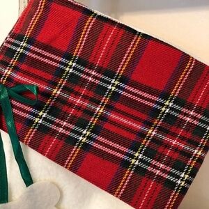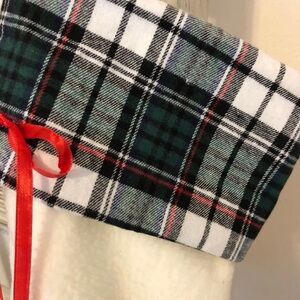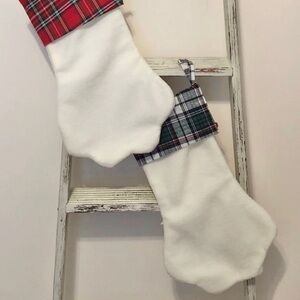 NWOT Paw Pattern Christmas Stockings. They are so adorable. One is white with red plaid trim with hanging bones. The other is white with green plaid trim with hanging fish bones.