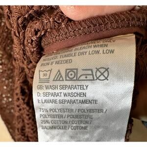 Beautiful fine lace long cardi in a pretty chocolate brown. I loved this with some white jeans and a neutral colored cami--the perfect luxurious neutral outfit. I think it would make an elegant bathing suit cover up as well. Beach, dinner, music festival, work... this sweater can go anywhere, with style!