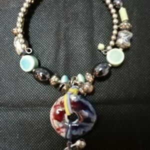 Bold necklace with a mix of vibrant beads. Features a striking pendant with artistic design. Perfect for statement looks & Amazing with jeans and white tee.