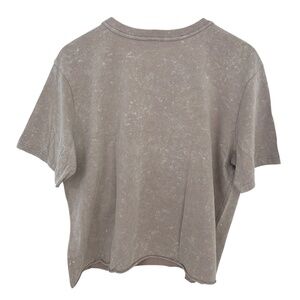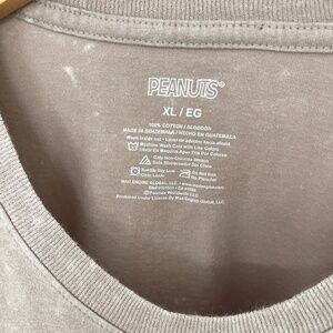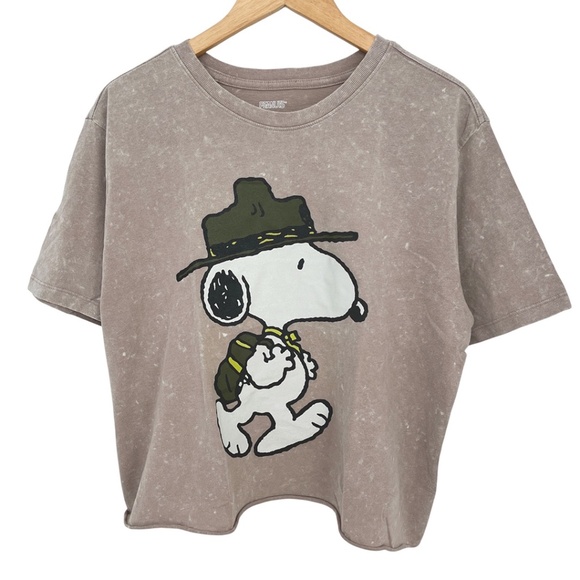 Peanuts Ranger Snoopy Women's Cropped Short Sleeve T-Shirt. Unfinished, rolled hem. Screen-printed Ranger Snoopy graphic on front. Color: Light mottled brown. Fabric has a pre-washed, worn look. 100% cotton.