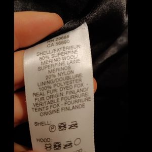 This is a new without tags black superfine merino wool blend coat. Original model has a fox fur hood, but the hood was lost at factory or during shipping. Size 6.