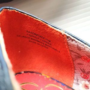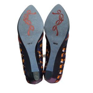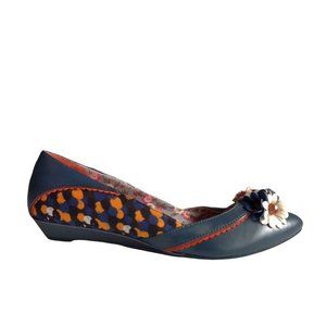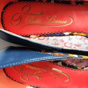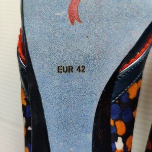 Peotic License navy blue Razzmatazz wedge; multi-color floral and jeweled detail on vamp; 1-inc covered heel; fabric upper; man-made balance. New without tag (from my personal collection). Size 11M (42 EUR 42). Ref: S-372 #0880, 210612.