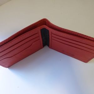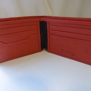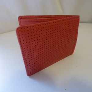 This soft leather wallet in poppy red has 6 card slots, 2 side slots, and 1 main bill slot. The perforated leather lends a weightlessness to this wallet. Never used, perfect condition!