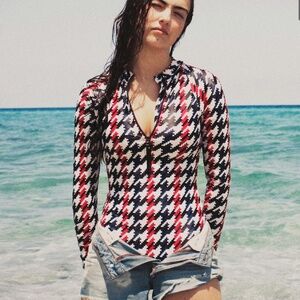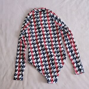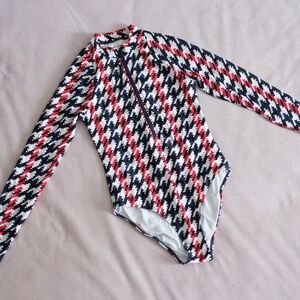 Stylish long-sleeve one piece. Features bold houndstooth pattern. Front zipper closure. Perfect for a chic swim look.