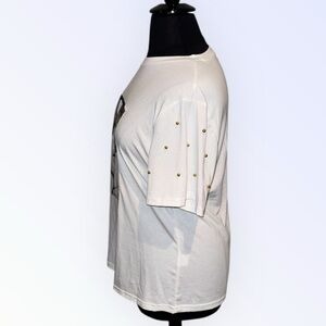 Trendy graphic tee featuring a bold design with gold sunglasses. Perfect for casual wear. Gold beads on sleeves.
