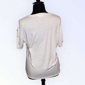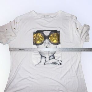 Trendy graphic tee featuring a bold design with gold sunglasses. Perfect for casual wear. Gold beads on sleeves.